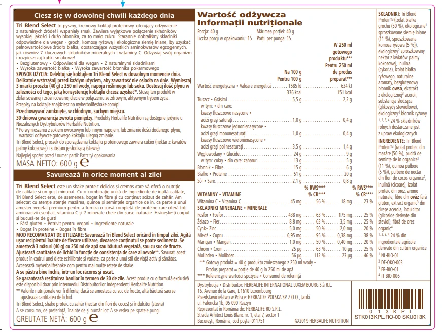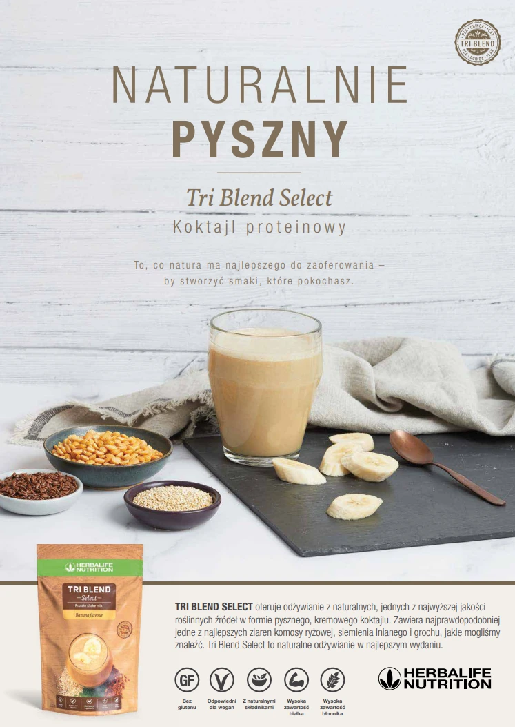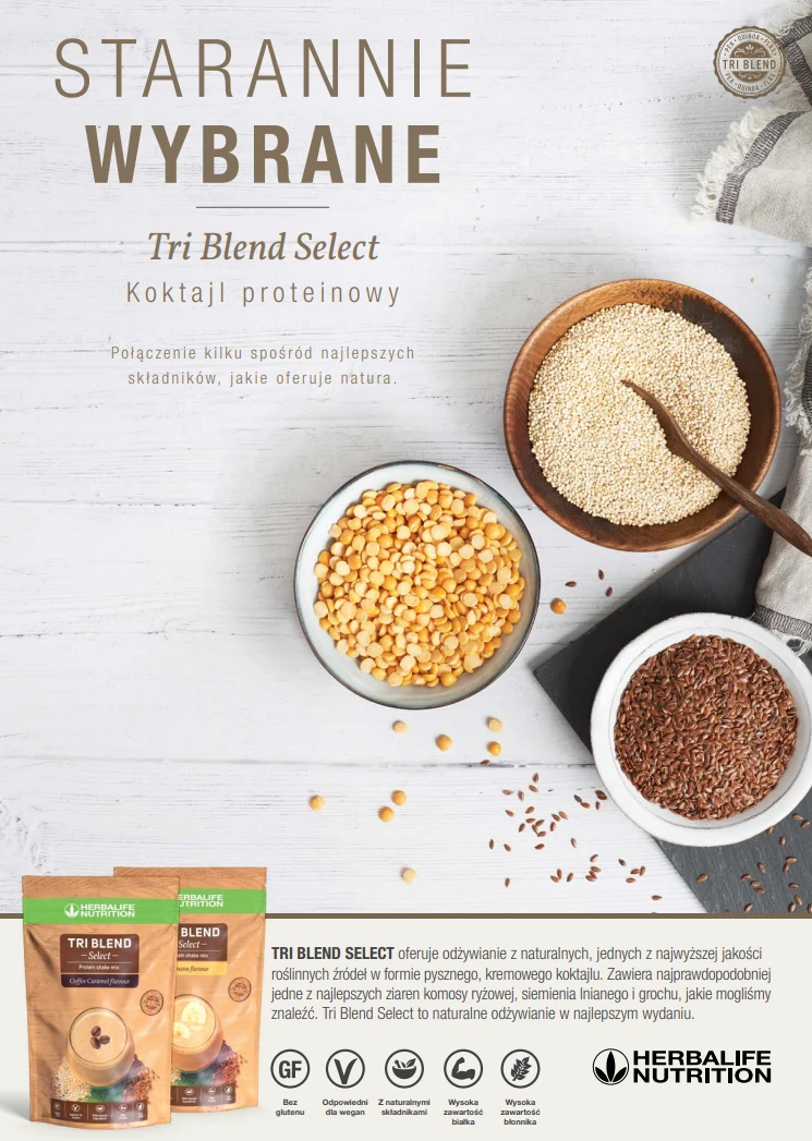 Tri Blend Select to koktajl wellness, który łączy w sobie wysoką zawartość białka z minimalną ilością cukrów, wykorzystując składniki naturalne i ekologiczne. W jego skład wchodzą starannie wyselekcjonowane, najlepsze odmiany surowców takich jak ekologiczne siemię lniane z Kanady i komosa ryżowa z Kolumbii.